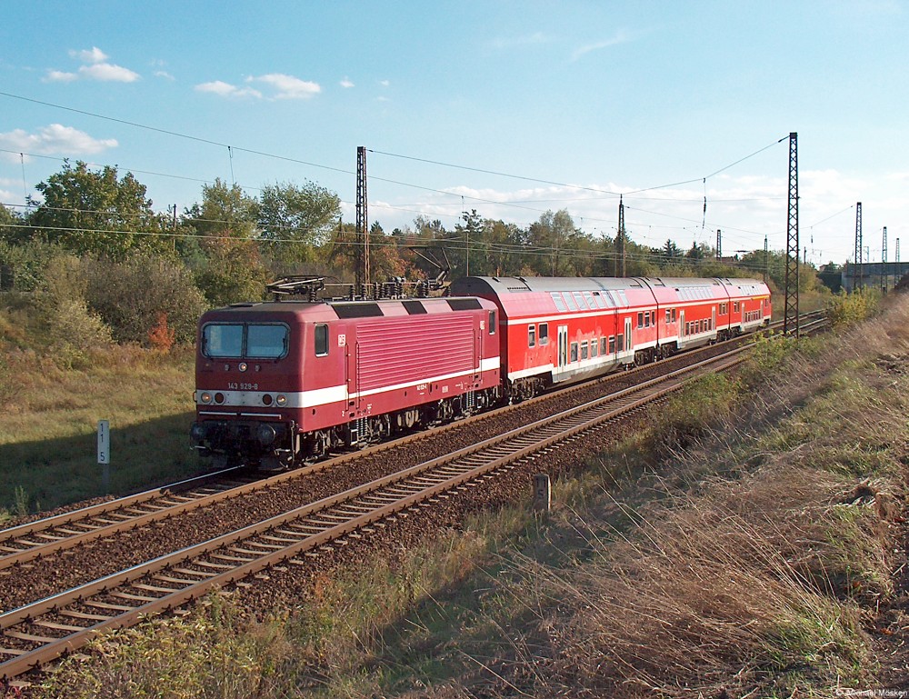Da kam sie nochmal vor die Linse: 143 929-8, in der vom Aussterben bedrohten Lackierungsvariante, am 07.10.04 vor RB 36444 nach Halle(Saale) Hbf. |