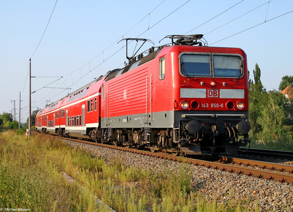 143 850-6 strebt am 31.08.05 mit RB 26449 am Haken der Sonne entgegen als sie Halle-Ammendorf passiert. |