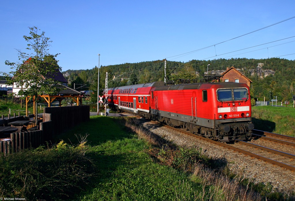 143 122-0 legt sich am 16.10.06 mit einer S1 nach Bad Schandau in Rathen in die Kurve. |
